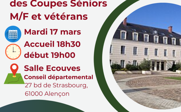 Nous avons le plaisir de vous inviter au tirage au sort des 1/4 de finale de la Coupe Seniors (Seniors Garรงons, Seniors Filles et Vรฉtรฉrans).