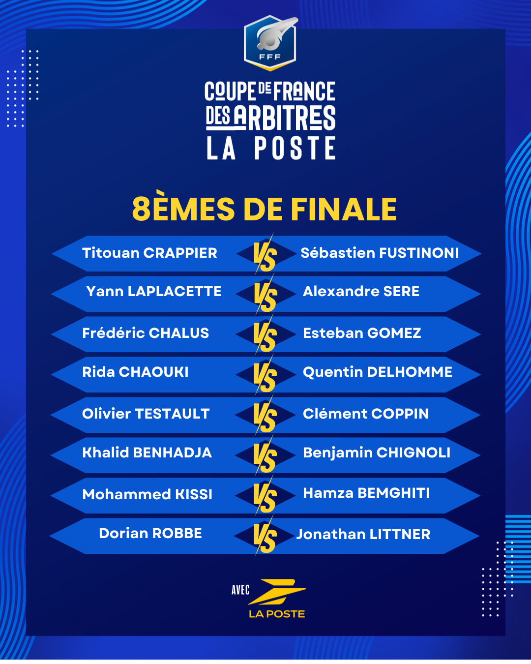 Après une phase de quiz marquée par la mobilisation exceptionnelle de plus de 8 600 arbitres amateurs, trente-deux d’entre eux ont accédé aux 16ᵉˢ de finale de la Coupe de France des arbitres La Poste, première étape de la phase terrain.